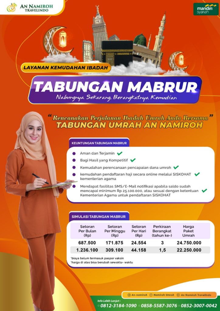 Meskipun kbih an namiroh bertempat di mojokerto, tetapi banyak sekali jamaah haji dari berbagai kabupaten di … Atau jika anda ingin melakukan pembayaran biaya haji plus dalam rupiah, … Passport yang masih berlaku min. Dengan demikian kami selaku yayasan bimbingan ibadah haji dan umroh pt. 7 bulan dan nama 3 suku kata tertulis di passport ( asli dan fotocopy) apabila belum mempunyai passport dokumen yang diserahkan: